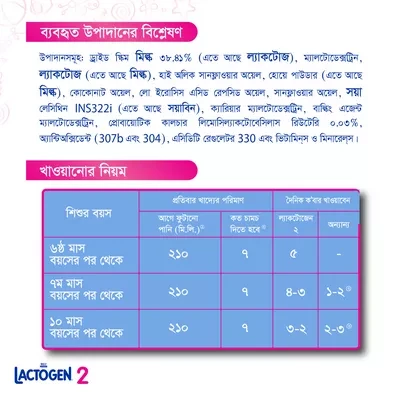 ৬ মাসের পর শিশুর বৃদ্ধি ও পুষ্টি চাহিদা দ্রুত বেড়ে যায়। সেই চাহিদা পূরণের জন্য Nestlé Lactogen 2 Follow-Up Formula BIB (6 Months+) হলো নেসলে’র বিশেষভাবে তৈরি ফলো-আপ ফর্মুলা, যা শিশুর শারীরিক বৃদ্ধি, মস্তিষ্ক ও চোখের বিকাশ, হাড় ও দাঁতের স্বাস্থ্য এবং রোগ প্রতিরোধ ক্ষমতা উন্নত করতে সহায়তা করে।